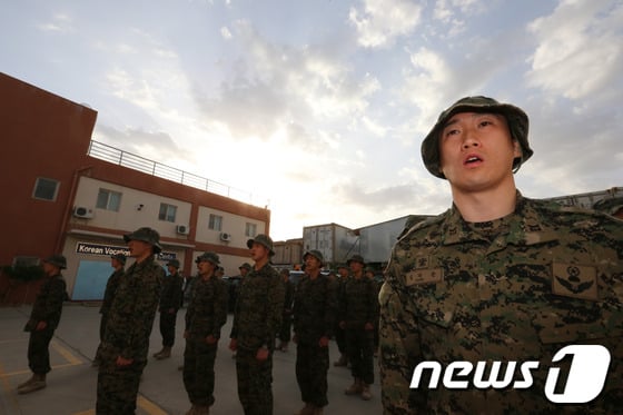 (바그람(아프가니스탄)=뉴스1) 사진공동취재단 아프간 재건 지원단(오쉬노 부대) 장병들이 17일 오전 아프가니스탄 바그람기지에서 점호를 하며 육군 복무신조를 제창하고 있다.