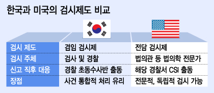 이는 우리나라와 미국의 검시 제도 차이에 기인한다. 우리나라는 별도의 전문 검시관이 아닌 경찰이 검시까지 직접 맡는 '겸임 검시제'를 따르고 있다. 반면 미국은 일반 경찰이 아닌 법의학 전문가들이 검시를 전담하는 '전담 검시제'를 채택하고 있다.