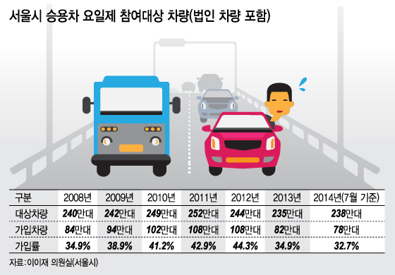 이에 따른 서울시의 인센티브 감면액은 지난해 기준 자동차세 77억원, 시영 주차장 요금 2억원, 남산 1·3호 터널 통행료 6억원 등 약 85억원 수준이다. 승용차 요율제에 가입한 서울시 차량은 올해 7월 기준 78만대로, 대상차량 238만대의 32.7%가 가입돼 있다.