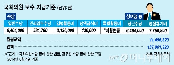 이 외 상여금은 △정근수당 646만4000원 △명절 휴가비 775만6800원으로 연봉은 1억3796만1920원에 달한다. 국회의원 300명에 대한 1년 세비로 413억8857만6000원이 들어가는 셈이다. 월로 따지면 30억9352만8000원이다. 여기에 사무실 운영, 차량유지, 출장, 정책개발, 자료발간 등에 들어가는 세비까지 포함하면 실제 받는 금액은 더 많다.