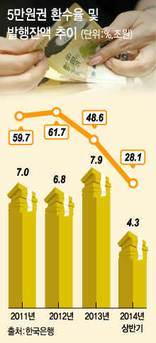 시중에 풀린 5만원권이 금고나 장롱에 갇힌 채 제대로 돌지 않으면서 올 상반기 5만원권 환수율이 지난해 대비 절반 수준으로 급락하는 등 '5만원권 증발'이 심각하다는 판단에서다.