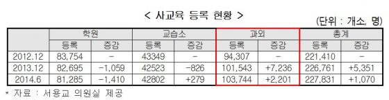 국회 교육문화체육관광위원회 서용교 의원(새누리당)이 교육부로부터 제출받은 자료에 따르면 2012년 이후 학원과 교습소의 등록건수는 줄거나 비슷한 수준인데 반해 개인과외는 크게 증가한 것으로 밝혀졌다.