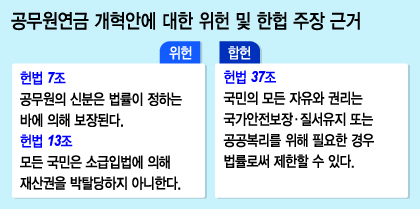 공무원들에게 불리한 연금 제도 개편이 '위헌'이라는 주장의 근거는 크게 2가지다. 헌법상 '공무원 신분보장', '소급입법에 따른 재산권 침해 금지' 원칙이다.