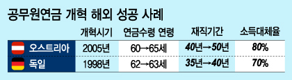 두 국가의 공무원연금 개혁은 비교적 긴 시간 진행돼 상대적으로 저항이 적었다는 게 전문가들의 분석이다. 실제 오스트리아는 2000년대 초 개혁안이 대규모 반대시위에 부딪치자 집권당이 야당에 '더 좋은 개혁안'을 요구하며 검토안을 마련했다.