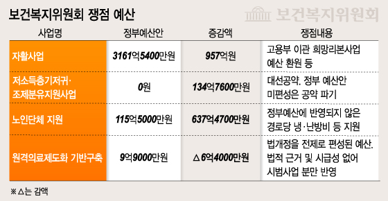 고용노동부로 이관되는 희망리본사업의 본래 취지를 살리기 위한 예산과 저소득층기저귀·조제분유지원사업 예산, 경로당 냉·난방비 예산 등 약 2조8500억원 가량이 정부가 제출한 당초 복지부 예산안보다 늘었다. 여성가족부의 내년도 예산 6424억원보다 복지부 예산 증액분이 4배 이상 많다.