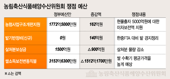 예결소위는 그러나 쌀소득보전변동직불 사업비에 대해선 1512억여원을 감액했다. 정부가 지난해 쌀의 수확기 평균가격을 예산안 편성 당시 추정가격보다 높게 예상해 반영했기 때문이란 이유에서다.