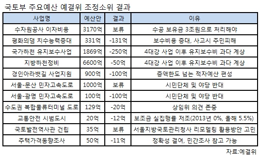 1869억원이 책정된 국가하천 유지보수사업과 6600억원을 투입하려던 지방하천정비사업도 4대강 사업 이후 유지보수비가 과다 계상됐다는 이유로 각각 250억원과 50억원 감액됐다. 경인아라뱃길 지원사업은 증액한도를 넘는 적자예산을 편성했다며 100억원이 삭감됐다.