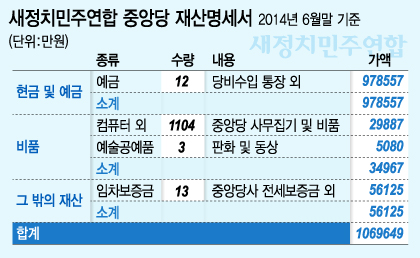 그러나 새정치연합은 전체 재산이 107억원에 그친다. 현금 및 예금이 98억원으로 대부분을 차지하고, 중앙당사와 시도당사의 임차보증금이 6억원이다.