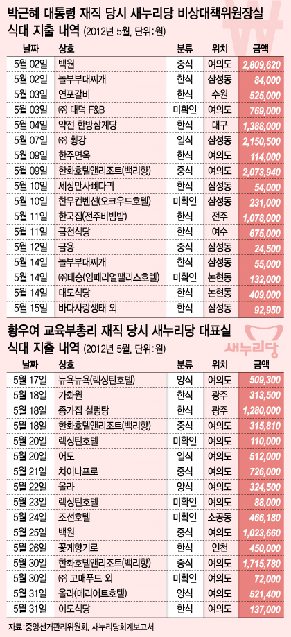 2012년 5월15일 새누리당 전당대회를 기점으로 박근혜 당시 비대위원장은 황우여 신임 대표에게 당권을 넘겨줬다. 2012년 5월 한달 간의 조직활동비 지출계정만 보면 박 대통령과 황 부총리가 각각 비대위원장, 대표로 재직한 각 보름 간의 비대위원장실, 대표실의 식대 지출 내역을 비교할 수 있다.