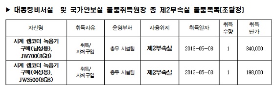 이날 최 의원이 조달청으로부터 넘겨받아 공개한 ‘대통령비서실 및 국가안보실 물품취득원장’에 따르면 청와대 제2부속실 명의로 8GB 용량의 시계 캠코더 녹음기 남녀용 각 1개씩을 구입했다. 제2부속실장은 청와대 핵심 3인방 가운데 한명으로 꼽히는 안봉근 비서관이다.