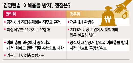 막판까지 논란이 됐던 것이 이해충돌방지 규정이었다. 금품수수와 부정청탁은 공직자의 정상적이지 않은 행위에 대한 규제지만 이해 충돌 방지는 공직자가 자신의 직무 수행과정에 가족들과 관련된 문제여서 풀기가 더 어려웠다. 규제 범위가 광범위해지고 자칫 연좌제 등 과잉 입법 논란이 벌어질 수 있기 때문이다.