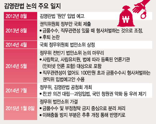 김영란법은 시작부터 상당한 논란을 낳았다. 2013년 8월 국회에 제출된 정부안은 예고안을 수정한 것이다. 직무연관성을 따지지 않고 처벌하자던 것이 연관성에 따라 처벌수위를 달리하는 것으로 조정된 게 대표적이다. 이 때문에 '후퇴' 논란을 빚었지만, 예고안 그대로는 도저히 법적 실효성을 기대할 수 없다는 현실론이 고개를 든 것이다. 정치권에선 "무시무시한 법안"이란 반응이 나왔다.
