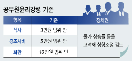 현행 공무원윤리강령에 따르면 식대가 1인당 3만원을 넘어서는 안된다고 규정돼 있다. 대통령령이 현행 공무원윤리강령을 준용할 경우 식사와 선물은 3만원 이하, 경조사비는 5만원 이하만 가능하다. 이는 물가상승률을 고려하면 낮은 수준이라는 설명이다.