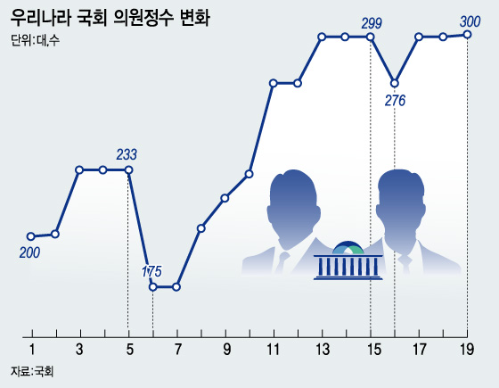 해외사례를 비교한 학자들은 의원정수가 늘어야 의회권력 참여자를 늘리고 기득권화를 방지해 대의민주주의가 제몫을 할 것으로 전망한다. 반면 국민들에게 정수 증가는 특권층 확대로 받아들여진다. 지난 대선 기간 의원정수를 200명으로 줄이자는 주장이 정치개혁의 상징처럼 제시됐으나 대선 이후엔 수면아래 가라앉았다.
