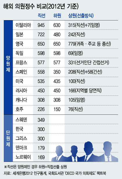 양원제 국가 가운데 상하원 모두 국민이 직접선출하는 나라면 양원 합계를, 영국처럼 상원이 명예직 또는 종신직이거나 간접선출·임명하는 곳이면 하원만 비교한 것이다.