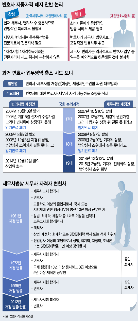 변호사에게 세무사·변리사 자격을 자동부여하는 조항을 삭제하는 변리사법·세무사법 개정안은 국회에서 꾸준히 논의돼 왔다. 2003년 법사위에선 회계사·변호사에게 세무사 명칭은 사용하지 못하게 하되 세무사 자격은 계속 부여하는 내용으로 법안이 수정 통과됐다.