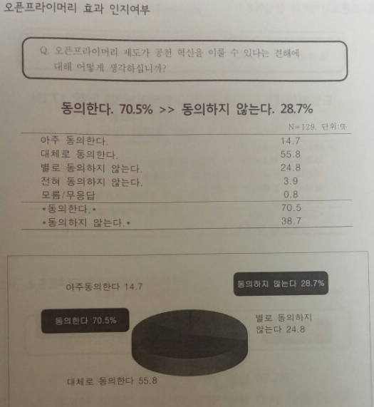한편 전체 응답자 129명 가운데 70.5%가 '오픈프라이머리 제도가 공천 혁신을 이룰 수 있다'는 주장에 동의했다. '아주 동의한다'가 14.7%, '대체로 동의한다'가 55.8%였다. 동의하지 않는다는 28.7%였다.