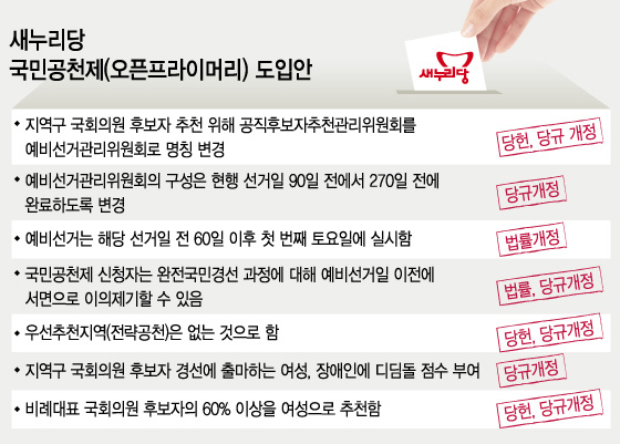 새누리당은 이날 오전 국회에서 의원총회를 열고 총선 후보를 국민이 직접 뽑는 오픈프라이머리(완전국민경선제) 도입안을 만장일치로 채택했다. 새누리당은 오픈프라이머리를 내년 20대 총선부터 적용한다는 목표다.
