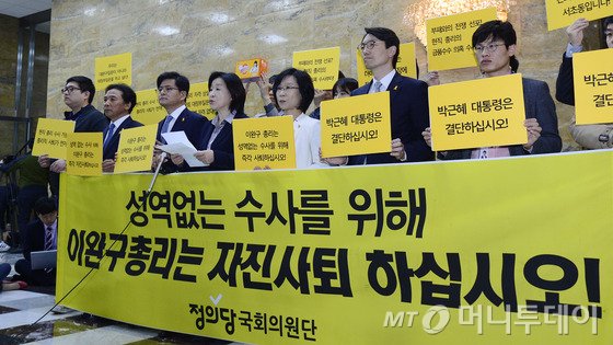 이 총리는 이날 10시30분으로 예정된 대정부질문을 위해 본회의장으로 들어서다 정의당 의원들의 시위를 마주했다. 심상정 원내대표 등 정의당 의원들은 플래카드를 펼치고 이 총리가 검찰 수사를 받아야 한다고 요구했다.