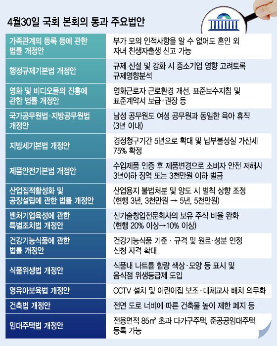 이 밖에도 △영화근로자 급여 현실화 △남성공무원 육아휴직 개선 △벤처창업 보유지분 규제 완화 △중소기업 규제영향 분석 의무화 △전용면적 85㎡초과 다가구 주택에 대한 준 공공임대주택 등록 허용 등에 대한 법안이 국회 문턱을 넘어 시행을 앞두게 됐다.