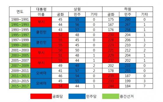 '아버지 부시' 행정부 때부터 미국 상하원 의석수를 살펴보면 클린턴 1기 행정부와 부시 2기 행정부, 그리고 지난해 11월 치러진 오바마 1,2기 행정부 중간선거에서 야당이 의회를 장악했다.