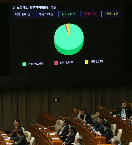 그리고 5월국회 본회의가 열린 12일 오후, 연말정산 보완책은 재석 244인 중 찬성 231인, 반대 4인, 기권 9인으로 국회 문턱을 넘게 됐다. 연말정산 논란이 촉발된 지 4개월만이다.