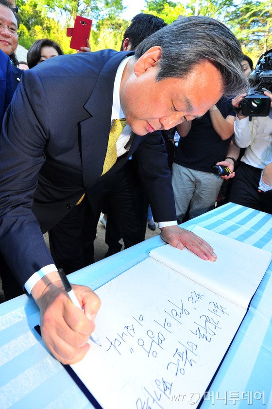 김 대표는 이날 오후 국회지방살리기 포럼을 참석한 뒤 경북 구미의 박 전 대통령 생각를 찾아 헌화·분향했다. 생가를 떠나기 전 방명록에 "날이 갈수록 더 높은 평가를 받는 '우리의 영웅'이십니다"라는 글을 남겼다.