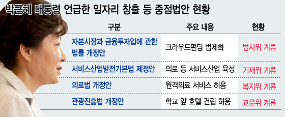 박 대통령은 지난 27일 청와대에서 열린 '일자리 창출을 위한 중소기업인과의 대화'에서 △크라우드펀딩 법제화 △서비스산업 육성 △원격의료 서비스 확대 △학교 앞 호텔 건립 허용 관련 법안들의 국회 장기 계류에 대해 답답함을 토로하며 조속한 처리를 촉구한 바 있다.