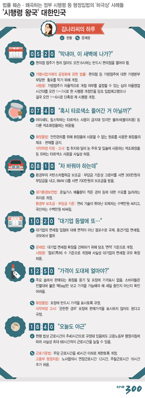 행정부의 '시행령'이 실제로 어느 정도 우리의 생활에 영향을 미치고 있는지, 머니투데이 '더300'(the300)이 2014년 6월20일 보도한 탐사리포트 '시행령 공화국'을 다시 한번 소개한다.