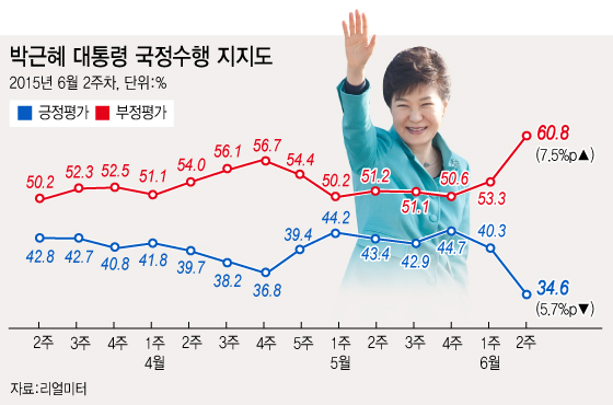 15일 여론조사기관 리얼미터가 발표한 6월2주차 주간집계에 따르면 박 대통령에 대한 긍정평가는 전주 대비 5.7%p 하락한 34.6%를 기록했다. 메르스 사태가 박 대통령 지지율에 영향을 끼치지 않은 2주 전(5월 4주차) 조사와 비교하면 10.1%p 떨어졌다. '국정수행을 잘못하고 있다'는 부정평가는 전주 대비 7.5%p 상승한 60.8%로 나타났다.