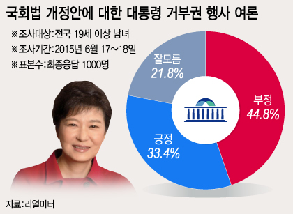 "최근 청와대가 국회에서 정부로 송부된 국회법 개정안에 대해 대통령이 거부권 행사를 시사하고 있는 것을 어떻게 생각하느냐"고 묻는 질문에, '바람직하지 않아 보인다'는 부정 답변이 44.8%로 '바람직해 보인다'는 긍정 답변 33.4%를 앞섰다. 잘 모르겠다고 대답한 비율은 21.8%로 집계 됐다.