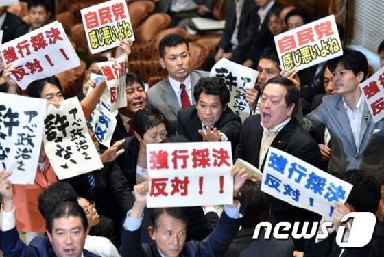 아베 총리의 측근인 모리 야스로 와세다대 아시아연구소 교수는 "보수세력의 결집을 통해 정치적 기반을 다져온 아베 총리에게 안보법안 통과는 정권의 존립과 연결된다"며 "아베노믹스의 데드라인이 24일이었던 만큼 돌발상황을 고려해 1주일 앞당겨 강행처리한 것"이라고 말했다.