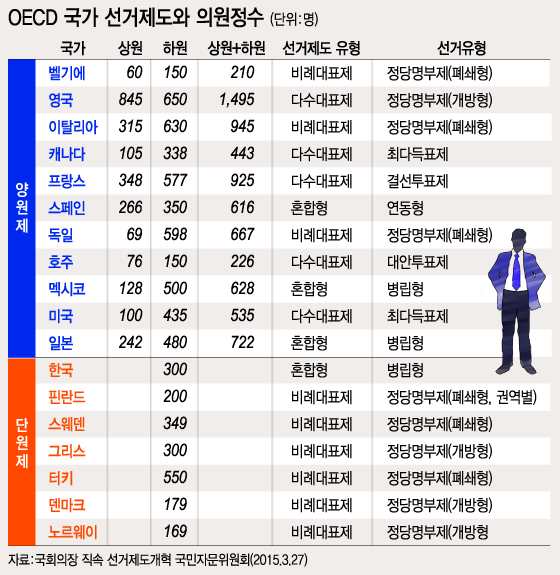 OECD 평균을 살펴보면 직선의원 1인당 인구비율은 9만6000명이다. 1인당 인구비율은 독일이 13만6000명, 프랑스는 11만3000명, 영국 9만6000명, 이탈리아 6만4000명이다. 한국은 1인당 16만5930명이다. 그만큼 우리나라에 국회의원이 부족하다고 볼 수 있다.