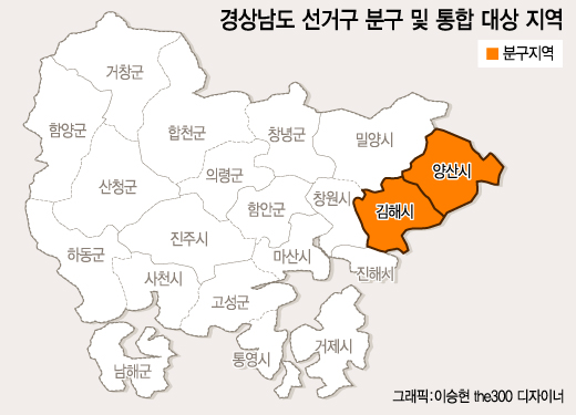 ◇김해시을은 동 조정, 양산은 분구될 듯 =경남은 통합 대상 지역구는 없고 김해시을과 양산시 등 분구 대상만 2개 지역구가 있다. 김해시을은 총선 불출마를 선언한 김태호 새누리당 의원의 지역구로 김해시갑(민홍철 새정치민주연합 의원)과 동 조정을 통해 인구 기준을 총족할 수 있어 변화가 크지는 않을 전망이다. 지난 6월말 현재 인구수는 김해시을이 31만819명이고 김해시갑은 21만6561명이다.