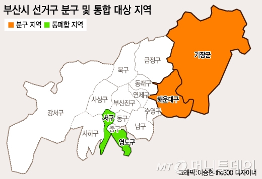 부산 경남 지역의 20대 총선 선거구 획정은 거물 정치인들의 지역구가 맞물린 부산 영도와 서구를 어떻게 조정하느냐가 최대 관심사다.