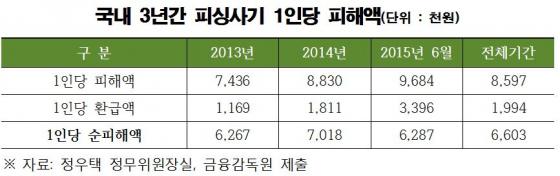 피해자 1인당 피애금액이 △2013년 743만원 △2014년 883만원 △2015년6월 기준 968만원으로 증가 추세다.