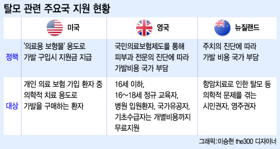 해외 주요 국가들은 중증 탈모환자에 대해 국가 차원의 지원을 하고 있다. 지원은 주로 가발 구매에 따른 보조금 지원 형식으로 이뤄진다.
