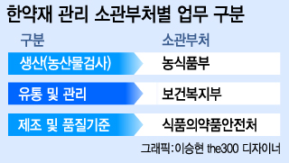 농식품부는 한약재 생산과정에서의 원산지 표시를, 복지부는 한약재의 수급 및 유통관리를 담당하고 있다. 식약처는 한약재 품질기준과 한약재 제조·관리를 맡고 있는 상황이다.