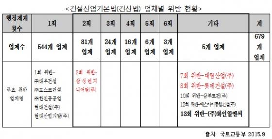 건산법 위반으로 행정제재처분을 받은 업체는 679개(940건)로, 2회 이상 행정처분을 받은 업체는 135개(19.9%)다.