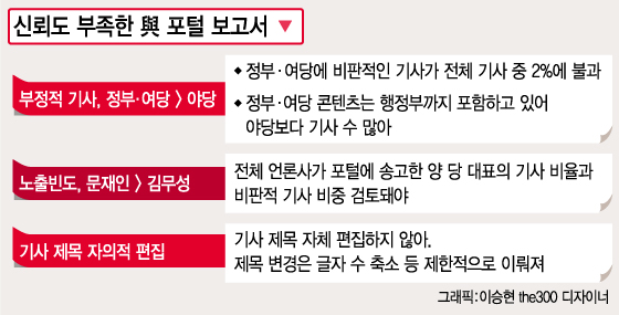 보고서가 거론한 문제점은 크게 △여권에 부정적 기사가 더 많다 △문재인 대표의 노출빈도가 김무성 대표보다 높다 △제목을 자의적으로 편집한다 등 3가지 부분이다.