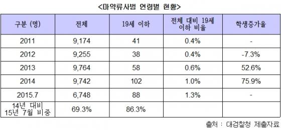 2012년 0.4%였던 청소년 마약사범 비율은 2013년 0.6%, 2014년 1%, 올해 7월기준 1.3%까지 올랐다.