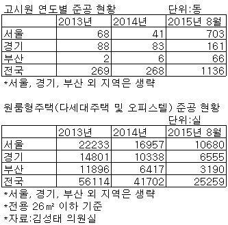 반면 원룸형 주택의 준공건수는 감소 추세다. 전국 다세대주택 및 오피스텔 연도별 준공현황에 따르면 전용 26㎡ 이하 다세대주택 및 오피스텔은 2013년 5만6114실에서 지난해 4만1700실로 줄었다. 올해의 경우 8월까지 준공건수는 2만5259실에 그치고 있다.