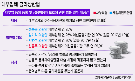 또 다른 서민금융 관련 대표입법은 '대부업법'(법안명 대부업 등의 등록 및 금융이용자 보호에 관한 법률 일부 개정안)이다. 현행 최고 34.9%로 규정돼 있는 현행 대부업체와 여신금융기관의 이자율 상한을 내리는 것을 뼈대로 한다.