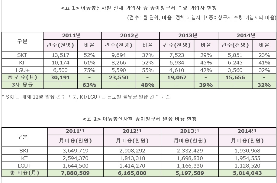 매월 종이청구서 제작과 발송에 투집되는 비용이 KT는 19억5000만원, SK텔레콤이 19억3000만원, LG유플러스가 11억2000만원 수준으로 연간 총 600억원 수준이다.