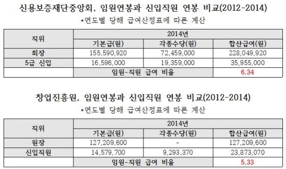 한국벤처투자의 경우 지난해 대표이사의 연봉은 기본급과 각종 수당을 합쳐 2억2148만원이었다. 신입사원 연봉은 3310만원으로 임원과의 임금격차는 6.69배를 기록했다. 같은 기간 신용보증재단중앙회는 회장의 연봉이 2억2805만원, 5급 신입직원의 연봉이 3596만원으로 차이는 6.34배로 집계됐다. 신용보증재단의 연봉격차는 2012년 5.83배, 2013년 6.10배로 점점 더 확대하는 모습이다.