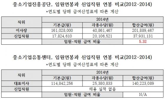 중소기업진흥공단의 경우 이사장의 연봉은 2억189만원, 신입직원은 3793만원으로 5.32배 차이가 났다. 역시 2012년 3.10배, 2013년 5배에서 더 벌어진 모습이다. 중소기업유통센터는 2012년과 2014년 신입직원을 뽑지 않았다. 2013년 대표이사의 연봉은 1억4757만원, 신입직원은 3339만원으로 4.42배 격차다.