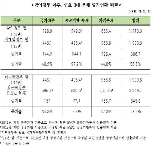 오 의원은 "이명박 정부도 집권 5년간 687조원에 달하는 부채가 증가해 평균 경제성장률 2.9%에 비해 평균 부채증가율이 9.4%로 3배 이상 많았다"며 "이명박·박근혜 두 정부 7년간 증가한 부채액은 국가채무 296조2000억원, 공공기관 부채 271조2000억원, 가계부채 465조1000억원 등 3대 부채 기준으로 총 1032조5000억원 늘었다"고 말했다.