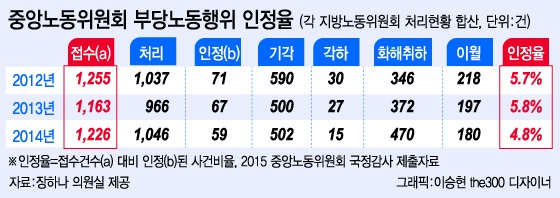 우선 중앙노동위에 의 부당노동행위 인정율은 2012년부터 지난해까지 평균 5.4%를 기록했다. 2012년 1255건이 접수돼 71건(5.7%)이 인정 됐으며, 2013년에는 1163건이 접수돼 67건(5.8%), 지난해에는 1226건 중 59건(4.8%)이 인정을 받은 것으로 집계됐다.