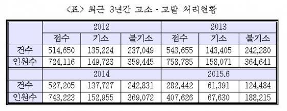 15일 국회 법제사법위원회 이춘석 새정치민주연합 의원이 법무부로부터 제출받은 자료에 따르면, 최근 3년간 검·경에 고소·고발 접수된 건수는 연 평균 52만8503건 인원으로는74만2041명에 달했다.