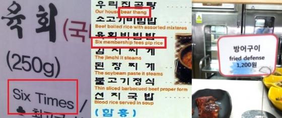 "육회는 'Six times', 곰탕은 'Bear탕', 방어구이는 'Fried defence', 돼지주물럭은 'Massage pork', 동태찌개는 'Dynamic stew'…"